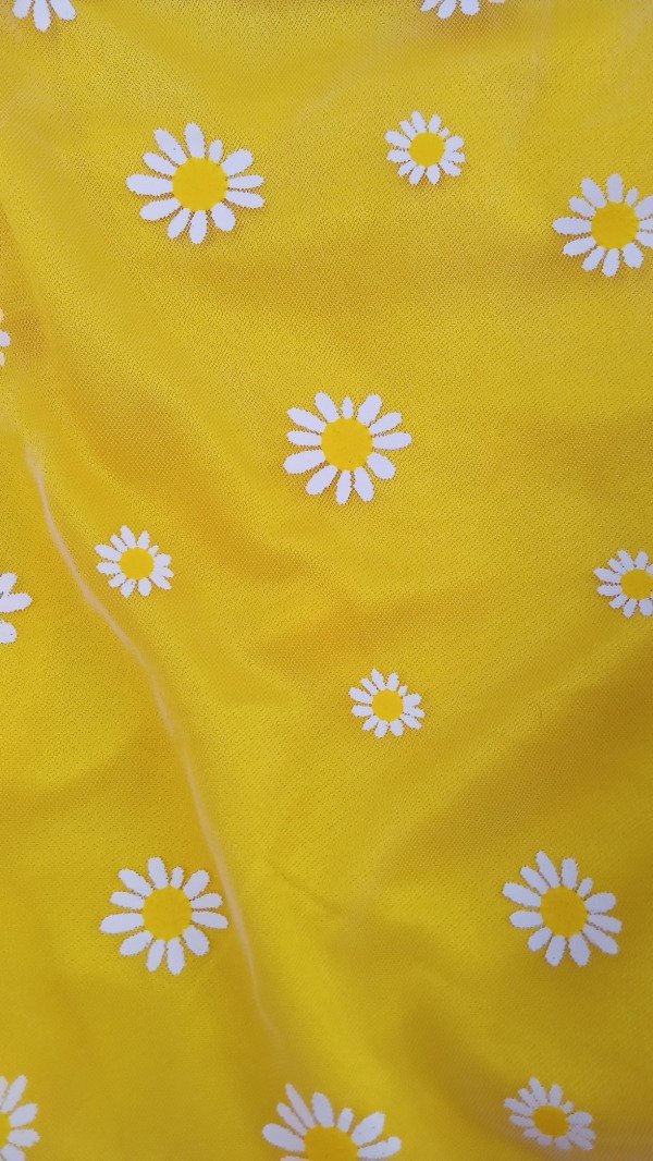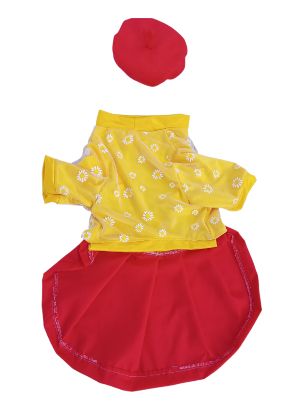 Vestido realizado en jersey amarillo, tul con margaritas y falda roja tableada de batista. Viene con boina para complerar el look más flikiti que vas a ver inspirado en uno de los que usa la protagonista en la serie margarita.