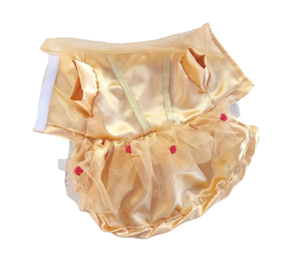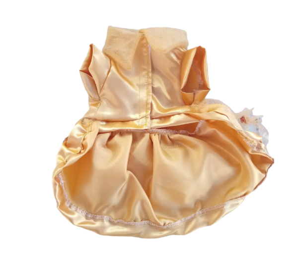 esta confeccionado en raso dorado tiene abrojo en el pecho y falda de tul con brillos con rositas.