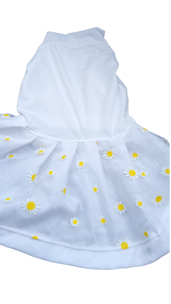 Vestido super ligero, comodo y delicado. realizado en jersey de algodón en la parte superior y tussor de algodón con tul con margaritas en la falda tableada. Es elastizado e hipoalérgenico