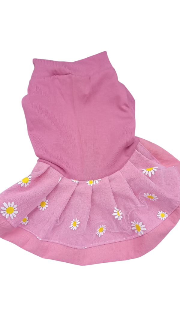 Vestido super ligero, comodo y delicado. realizado en jersey de algodón en la parte superior y tussor de algodón con tul con margaritas en la falda tableada. Es elastizado e hipoalérgenico
